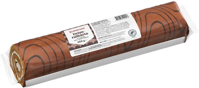 Drömrulltårta med fyllning med vaniljsmak och ringlad choklad ovanpå. 450 gram.