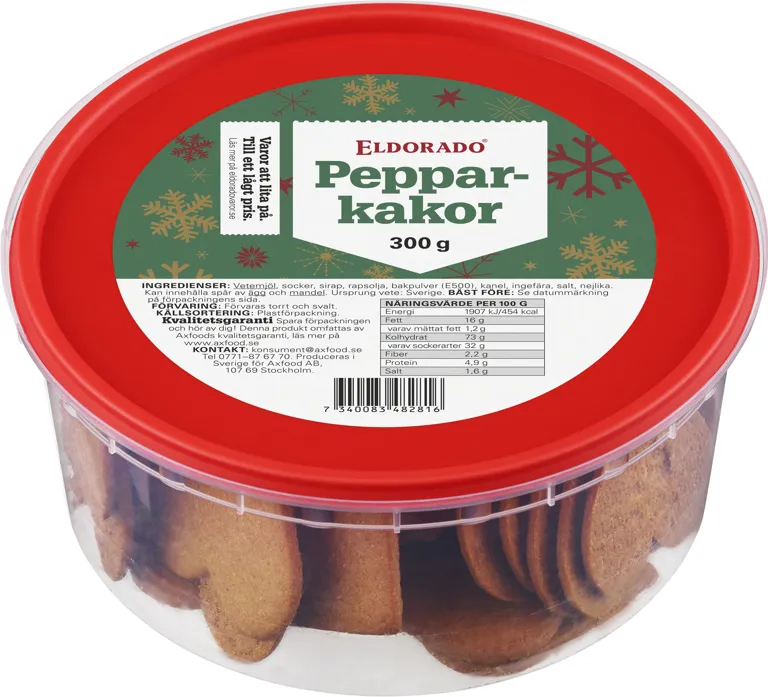 VETEMJÖL, socker, sirap, rapsolja, bakpulver (E500), kanel, ingefära, salt, nejlika. Kan innehålla spår av ÄGG och MANDEL.