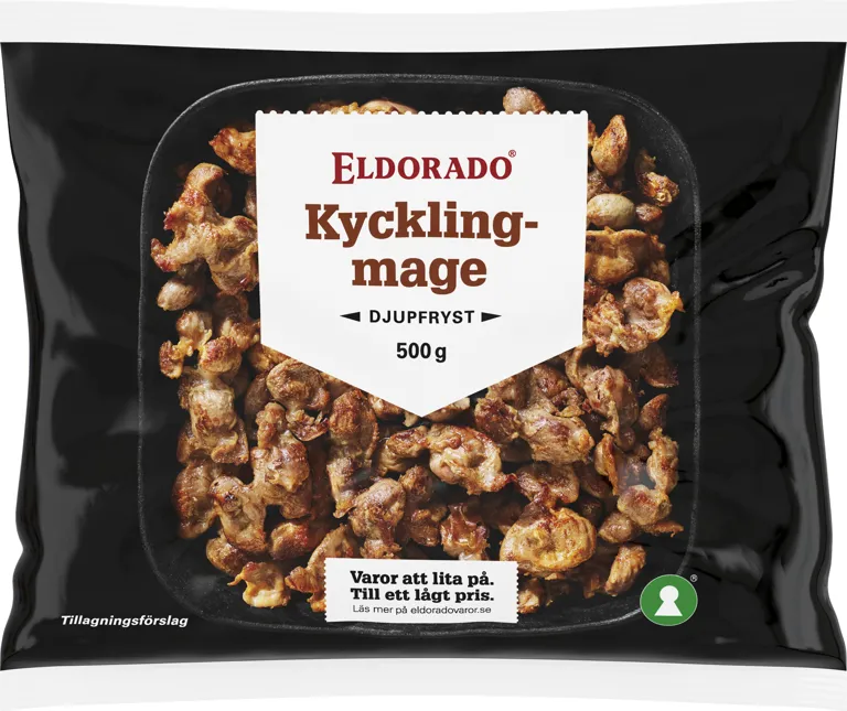 Djupfryst kycklingmage. Eldorado har som mål att alla förpackningar ska gå att materialåtervinna till 2025. Som en del av detta har vi minskat mängden tryckfärg och infärgat material på påsarna till vår djupfrysta kyckling, vilket ökar återvinningsbarheten. Tack för att du sorterar som plastförpackning.