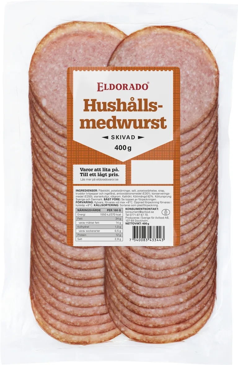 Skivad hushållsmedwurst. 400 gram.