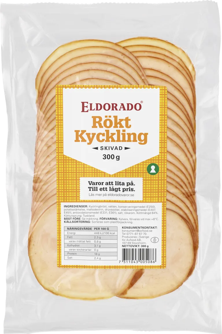 Kycklingbröst, vatten, konserveringsmedel (E250), potatisstärkelse, maltodextrin, druvsocker, stabiliseringsmedel (E407, E451), antioxidationsmedel (E331, E301), salt, rökarom. Köttmängd: 84%. Köttursprung: Tyskland.