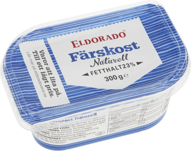 Naturell färskost är en mjuk färskost. Passar till en matig middagsbagel med rökt lax eller till din cheesecake. Fetthalt 23%. 300 gram.
