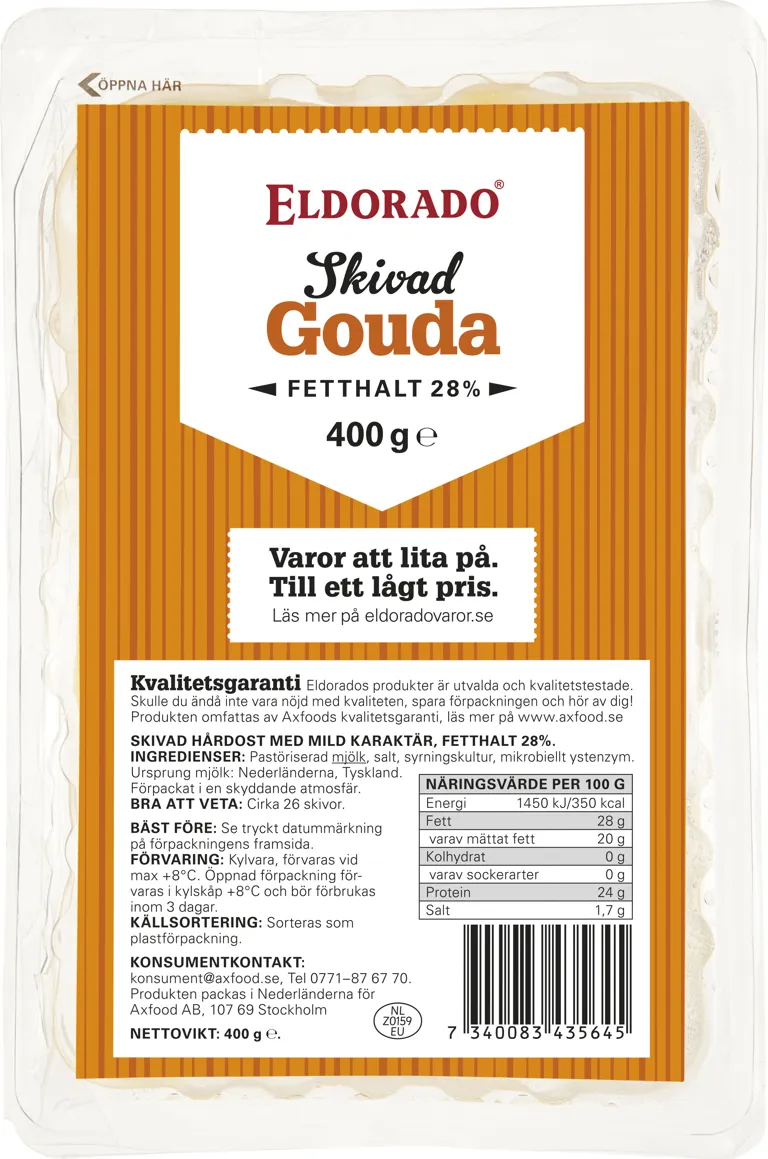 Eldorado Gouda 28% skivad med sin krämiga konsistens och en mild, men ändå rik smak, är denna ost idealisk för smörgåsar, sallader, och som en del av dina favoritmaträtter. 400g.