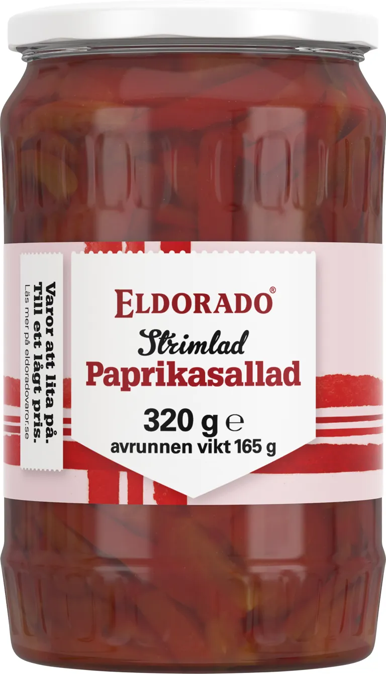 Strimlad paprikasallad. 320 gram, avrunnen vikt 165 gram.
