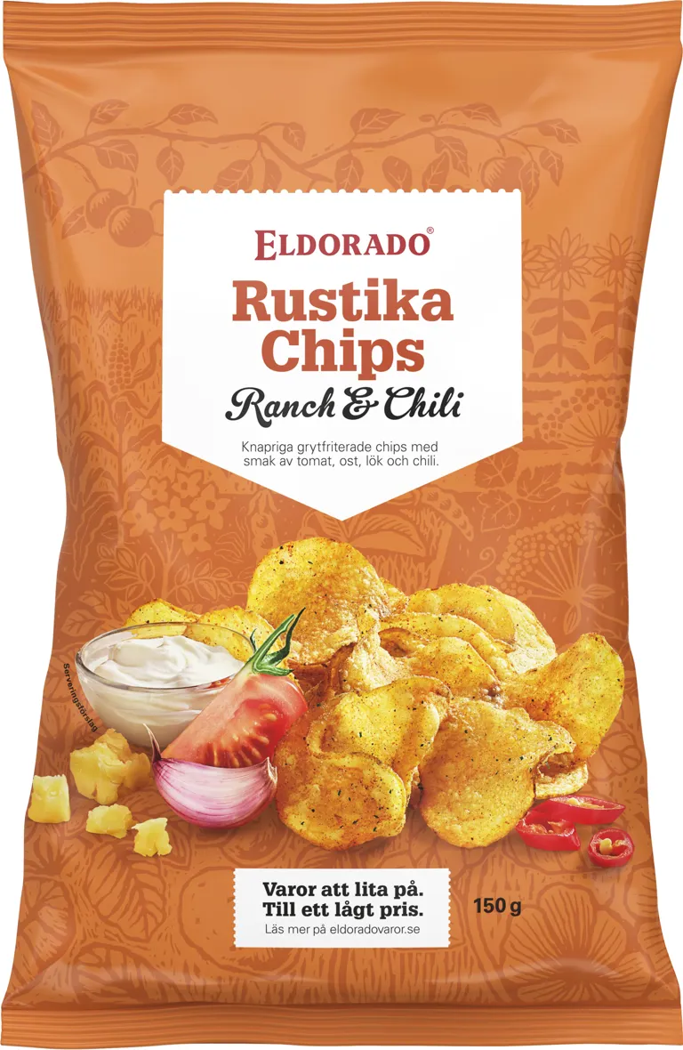 Rustika chips ranch & chili med smak av tomat, ost, lök och chili. 150 gram.
