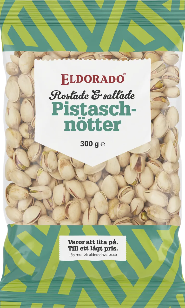 PISTASCHNÖTTER med skal, salt 1,2%. Kan innehålla spår av JORDNÖT, MANDEL, HASSELNÖT, VALNÖT, CASHEWNÖT, PEKANNÖT, PARANÖT och MACADAMIANÖT.