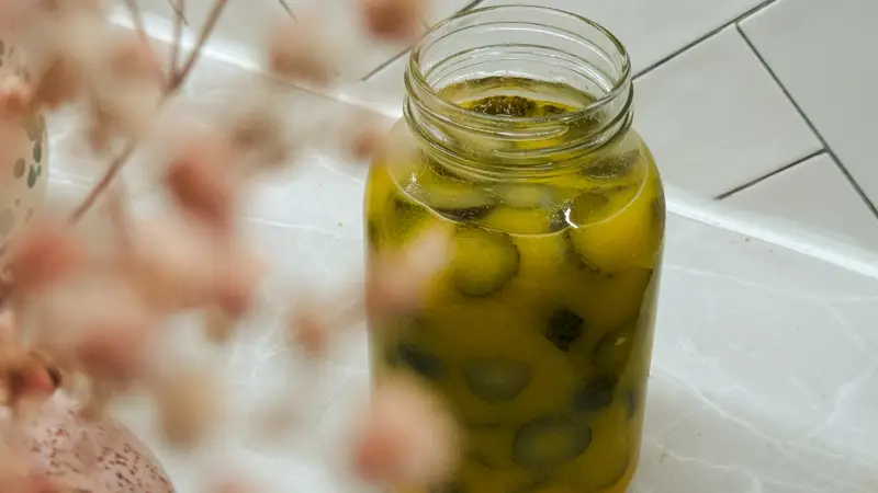 En busenkel inläggning med krispiga inlagda saltgurkor, honung och gurkmeja. Med produkter från Eldorado räcker receptet till 4 personer och kostar ca 11 kr per portion.