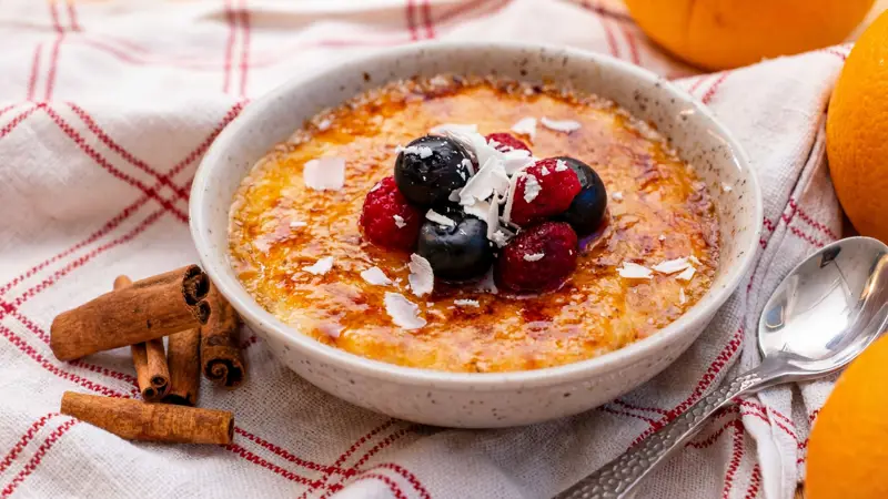Unna dig själv en tomtebrûlée i år! Med vit choklad, grötris, zest från apelsin, färska bär och den knäckigaste ytan hittar du en dessert som garanterat gör succé.